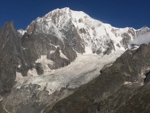 The crest was very nice. We had views of the south wall of the Mont Blanc range. We walked below colossal peaks covered in glaciers. One of the first that we saw was the one that Skyway (that we rode yesterday) ascends. It was neat to get that perspective of yesterday's adventure.